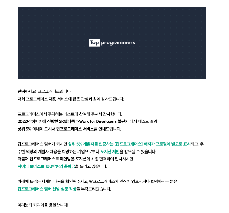메일을 확인해보니 작년 하반기 SKT T-worx 코딩테스트에서 상위 5%이내 들었다고 하며 탑프로그래머스 인증뱃지를 달 수 있는 기회라고 안내받았습니다.